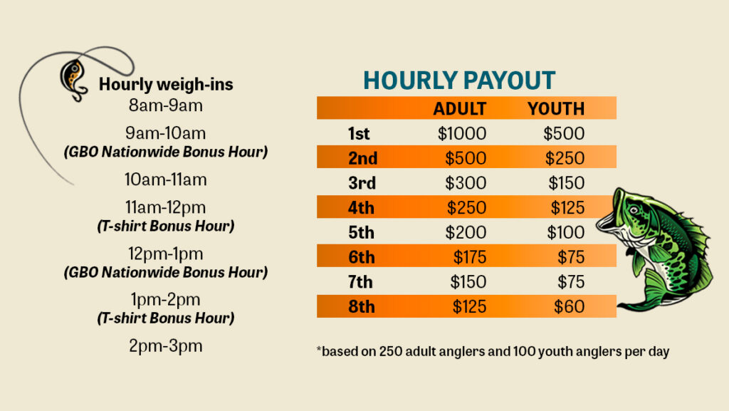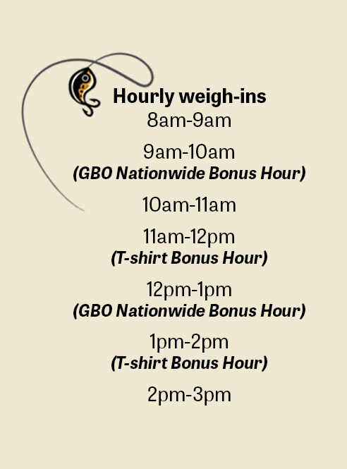 If you won 1st place in any hour in 2024 or fished 3 events in 2024, we will have 3 bonus hours each day that will double first place if you win the hour. Also, if you won 1st place in any hour in 2024 or fished three events and are the overall winner we will double the grand prize.